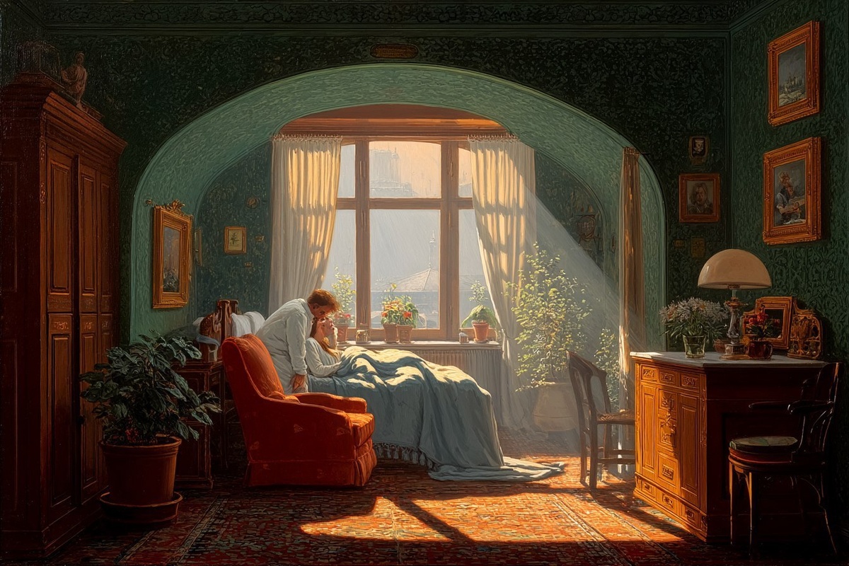 Создано на основе запроса: A preraphfelite painting, in the style of Michelangelo, a father is poorly with the flu, looks after his beloved teenage daughter who is equally unwell, there is gorgeous lighting in this room, and feeling of comfort and familial love --- Автоперевод: Прааффелитовая живопись, в стиле Микеланджело, отец плохо с гриппом, присматривает за своей любимой дочерью -подростком, которая одинаково нездоровена, в этой комнате есть великолепное освещение, и ощущение комфорта и семейной любви Хорошо выглядит? 🤔 https://dzen.ru/id/65c0c65c86e4f837c27b24d7 #ИИ #AI #нейросеть #midjourney #art