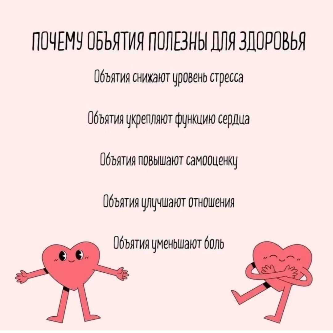 #Объятия – это не просто проявление нежности или симпатии... Объятия- это мощный инструмент, оказывающий глубокое воздействие на наше психическое и физическое благополучие. Научные исследования подтверждают, что объятия стимулируют выработку окситоцина- "гормона любви". Окситоцин играет ключевую роль в формировании социальных связей, снижении уровня стресса и тревожности, а также укреплении чувства доверия и близости между людьми. Этот гормон способствует снижению кровяного давления и снимает стресс. Более того, объятия оказывают терапевтическое воздействие на эмоциональное состояние. Они помогают справиться с чувством одиночества, изоляции и покинутости. Прикосновение и физическая близость, которые мы испытываем во время объятий, напоминают нам о нашей принадлежности к социуму и о том, что мы не одни в этом мире. Обнимаю вас 🫶🫶🫶