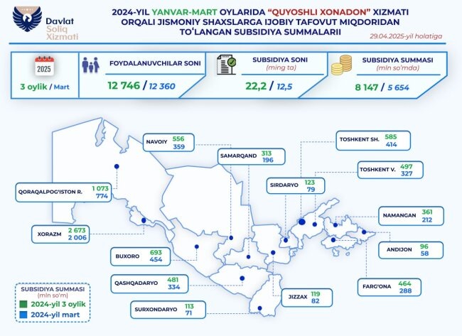 Наибольшая часть выплат приходится на Хорезмскую область - 2,6 миллиарда сумов, далее идут Республика Каракалпакстан - 1,1 миллиарда сумов и город Ташкент - 585 миллионов сумов.