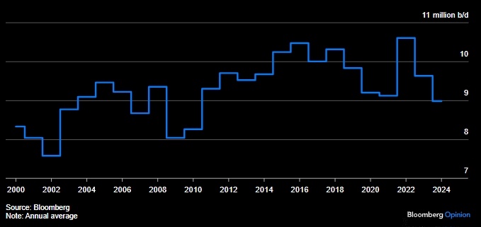 1) Саудовская Аравия поняла, что ее предыдущая политика «как можно ближе к 100 долларам за баррель» была неустойчивой, поскольку она потребовала бы дальнейшего сокращения добычи. Чтобы поддерживать высокие цены, добыча Саудовской Аравии в прошлом году была самой низкой с 2011 года. Если бы Эр-Рияд сохранил политику высоких цен, он, вероятно, не смог бы увеличить добычу ни в 2025, ни в 2026 году. Перспективы на период после этого — в 2027 или 2028 году — выглядели все более сложными для расширения, потенциально обрекая Эр-Рияд на вечно низкую добычу.