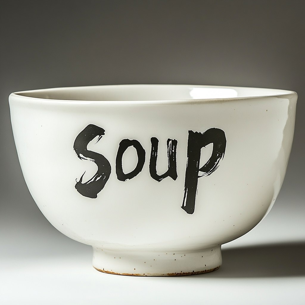 Создано на основе запроса: A large Chinese white porcelain soup bowl, with big character "soup" on it. --- Автоперевод: Большая китайская белая фарфоровая суп -миска с большим характером «суп» на нем. Красиво получилось? 🤔 https://dzen.ru/id/65c0c65c86e4f837c27b24d7 #ИИ #AI #нейросеть #midjourney #art