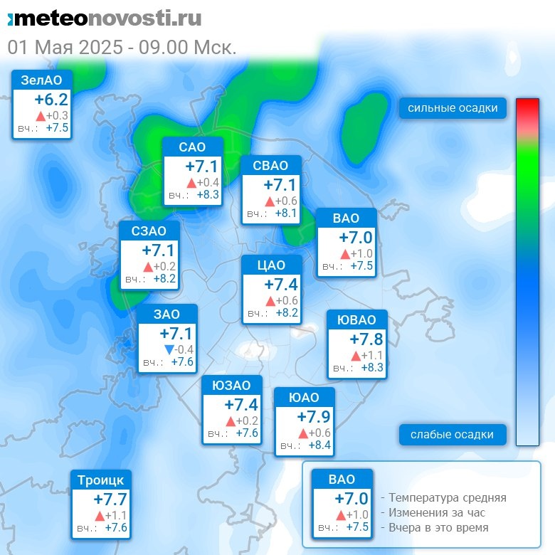 В 9:00 в Москве было от +5.9°C до +8.2°C, средняя температура +7.3°C #погода #Москва #весна #температура #1мая #четверг