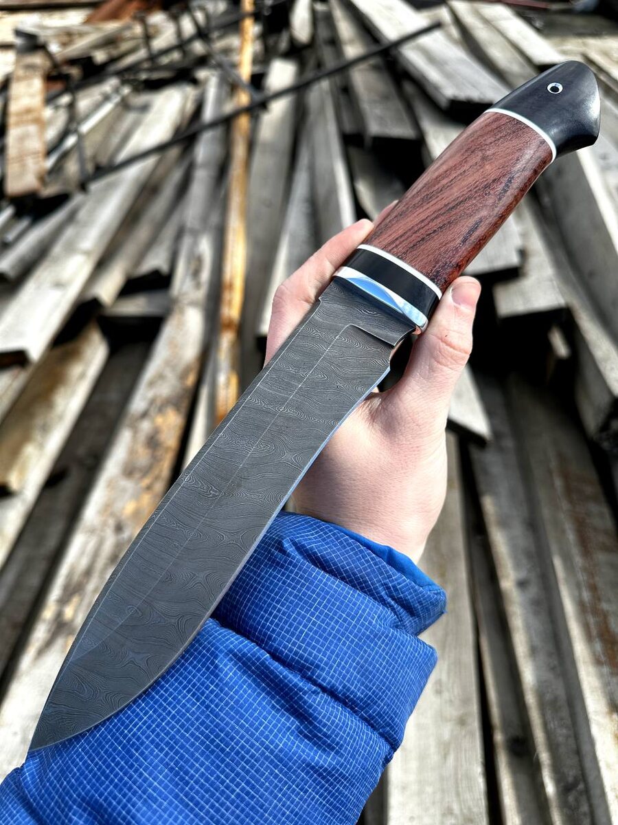 Большой рабочий нож «Медведь» из дамасской стали в 950 слоев. Удобный нож для колки, рубки и строгания. Рукоять на ноже выполнена из черного граба и бубинги. Твердость клинка (HRC): 62 Цена за нож: 10.040 рублей, со скидкой: 8.032 рубля. В комплекте идут ножны из натуральной кожи. Можем сделать формованные ножны +8000 рублей. Для заказа писать на @Nazarklinokbot или по тел +79101343831 WhatsApp/Viber