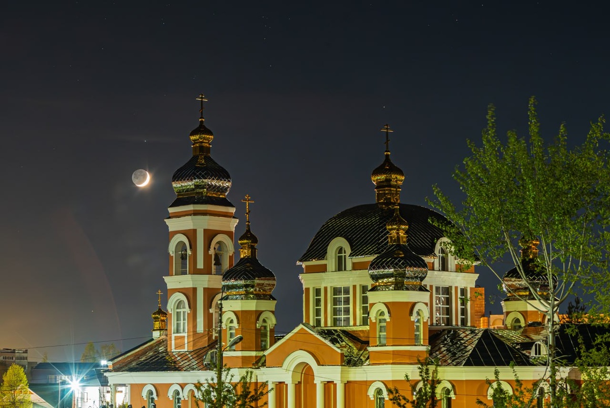 Соединение Юпитера и Луны (Пепельный свет) на фоне Храма Серафима Саровского Весна ... грусняшки - депресняшки, вечером помню были облака на горизонте, посему даже и не планировал снимать, выполз на вечернюю прогулку прошёл квартал и увидел кристально чистое после дождя небо и молодой месяц с юпитером ... пришлось вернуться за фотоаппаратом 🥹 #астрофото