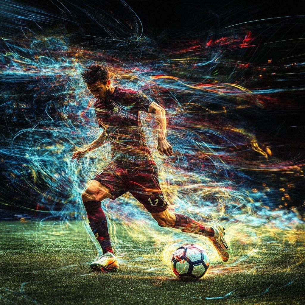 Создано на основе запроса: transcending soccer player and ball on the pitch dynamic motion blur movement surreal flow state futurism