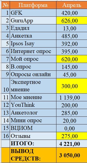 Апрель подошел к концу, пора подвести финансовые итоги. Сегодня расскажу о том, сколько удалось заработать и вывести денег с различных опросников и других сервисов дополнительного заработка. Добавились новые опросники: YouThink, Анкетолог, Мини опрос, ВЦИОМ и отзывы. Желтым отмечены те пункты, в которых сделала вывод средств: Также ближе к концу месяца начала проходить опросы за супруга, так как он забросил это дело и подключила ему еще пару новых опросников. Пока с его аккаунтов нигде не набралась сумма для вывода. Получились такие итоги: Итого удалось заработать за апрель с двух аккаунтов 5 275 руб. В итоговую сумму не входят баллы с «Моё мнение», так как вывод средств там осуществляется не в рублях, а в заказах призов. В остальных потихоньку коплю и вывожу деньги или сертификаты, обычно Ozon, а также на баланс телефона.