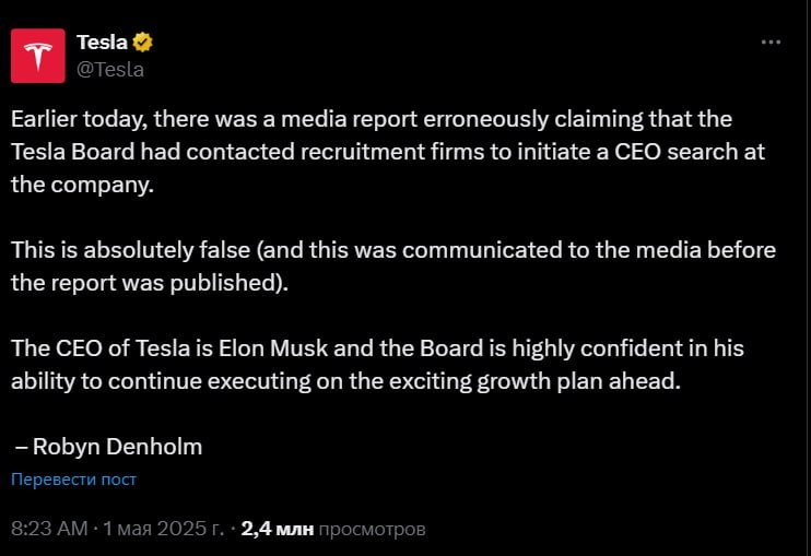 Компания Tesla опровергла информацию Wall Street Journal о том, что совет директоров начал поиск нового главы компании, который сменит Илона Маска. "Ранее сегодня в СМИ появилась информация о том, что совет директоров Tesla связался с кадровыми агентствами, чтобы начать поиск генерального директора компании. Это абсолютная ложь (и это было сообщено СМИ до публикации отчета). Генеральным директором Tesla является Илон Маск, и совет директоров полностью уверен в его способности продолжать реализацию захватывающего плана роста". В ответ на публикацию WSJ Маск заявил, что газета дискредитирует журналистику, публикуя заведомо ложную статью.