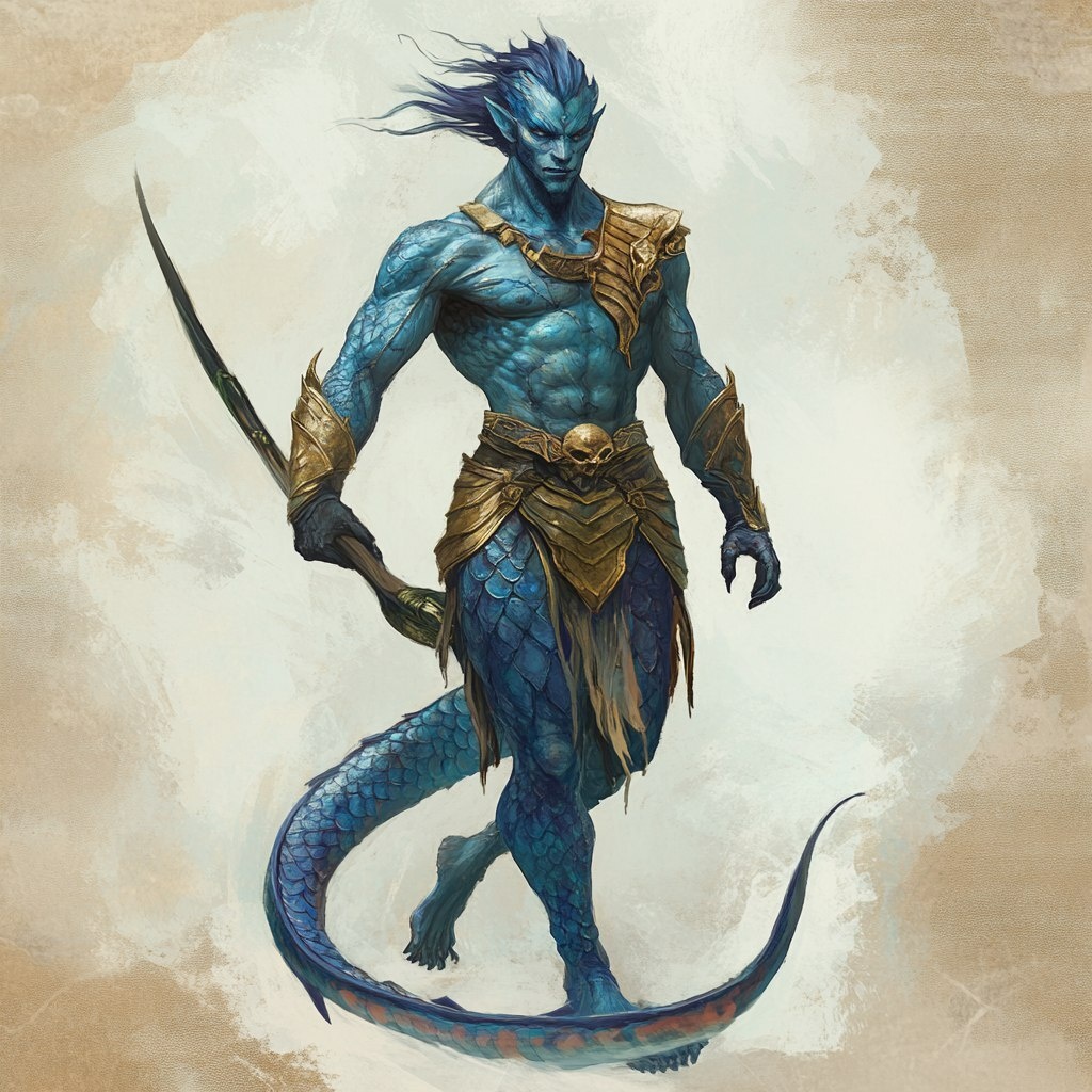 Создано на основе запроса: DnD male adult merfolk fighter, blue skin, 2 humanoid legs, tail