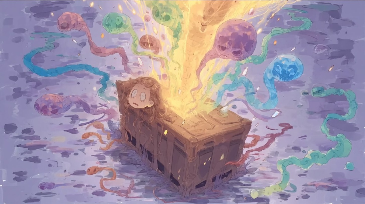 Создано на основе запроса: chaotic spirits explode from pandora's box box, animecore