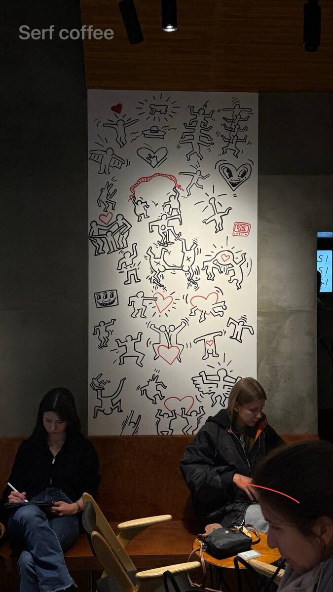 А вы узнали, к какому художнику сделана отсылка в Surf Coffee? Недавно, зайдя в Surf Coffee, я увидела на стене знакомый визуальный код — простые линии, силуэты танцующих фигур, динамика и ритм. Это был не оригинал и не реплика, но безошибочно узнаваемая отсылка к творчеству Кита Харинга — символа нью-йоркской уличной сцены 1980-х. Его стиль — контрастные цвета, графика, иконки (танцующие люди, собаки, младенцы) — стал не просто визуальным языком эпохи, а способом говорить о свободе, борьбе, любви и смерти. Харинг принципиально выходил за пределы музеев, рисовал в метро и на улицах, создавал Pop Shop, чтобы сделать искусство доступным каждому. «Искусство — это то, что освобождает душу, провоцирует воображение и побуждает людей идти дальше». — Кит Харинг И я задумалась — почему именно он? Я почитала немного о позиционировании Surf Coffee: — Интерьеры, вдохновлённые серф-культурой и уличным искусством, создают ощущение свободы. — Комьюнити вокруг бренда строится на поддержке локальн