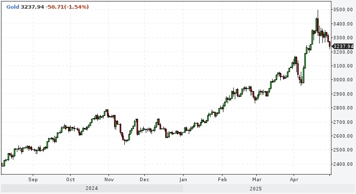 Утром, 1 мая, спот-котировка золота снижались на 1,5%, до $3239 за унцию.