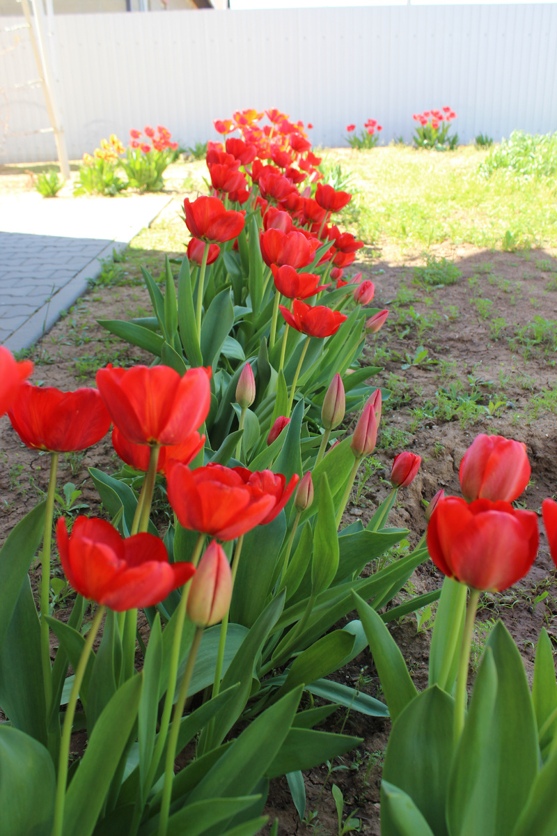 Красные тюльпаны, правда, уже отцвели. Фото сделаны в середине апреля.