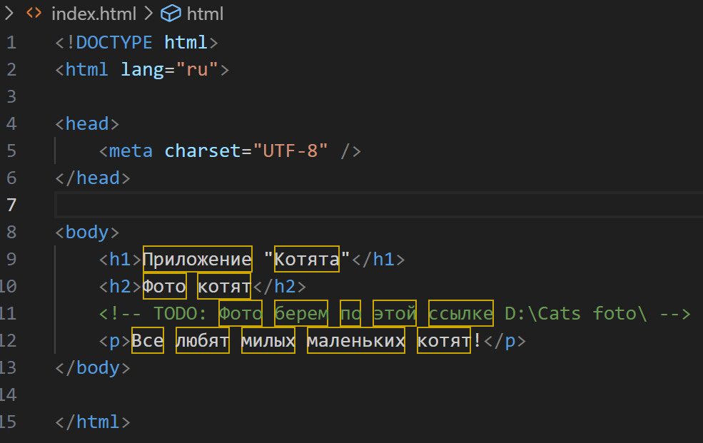Сегодня мы изучим такой элемент кода, как комментарий. Комментирование позволяет оставлять сообщения в коде, не влияя на отображение в браузере. Оно также позволяет сделать сам код неактивным. Комментарий в HTML начинается с <!--, содержит любое количество строк текста и заканчивается -->. Вот пример комментария с TODO: <!-- Удалить h1 -->. Давайте добавим в наш код информацию о папке, в которой лежат наши фото, но её не надо выводить в браузере. Добавляем такую строку: <!-- TODO: Фото берем по этой ссылке D:\Cats foto\ --> Отредактируем и сохраним полный код веб страницы, которую мы создали на предыдущем уроке. Он представлен ниже: <!DOCTYPE html> <html lang="ru"> <head> <meta charset="UTF-8" /> </head> <body> <h1>Приложение "Котята"</h1> <h2>Фото котят</h2> <!-- TODO: Фото берем по этой ссылке D:\Cats foto\ --> <p>Все любят милых маленьких котят!</p> </body> </html> Теперь давайте откроем страничку и проверим, что комментарий действительно не отображается на ней.