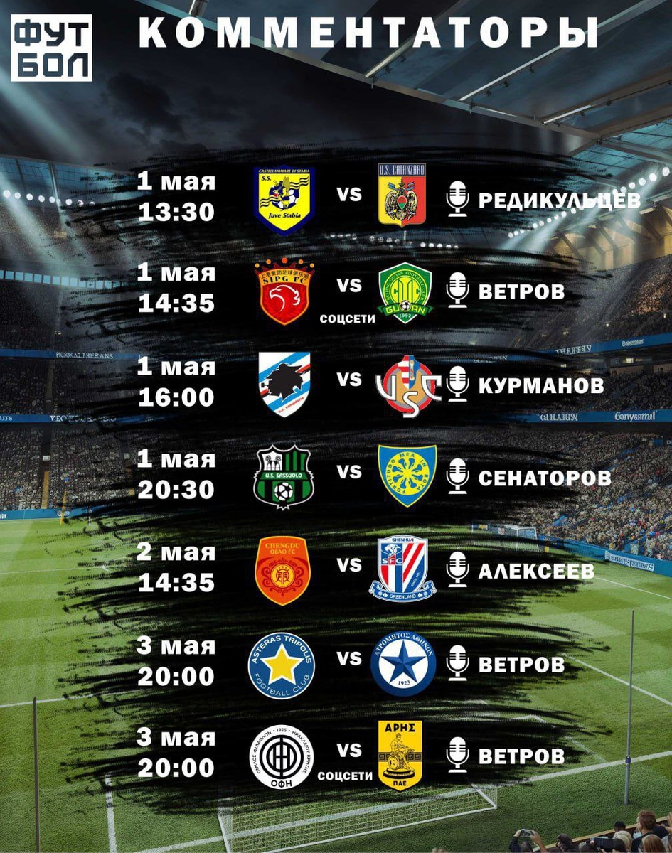 Итак, майские наступили и их можно провести вместе с ТК "Футбол"! Ловите список трансляций с комментаторами на уикэнд, который стартует уже сегодня! 🔥🔥🔥
