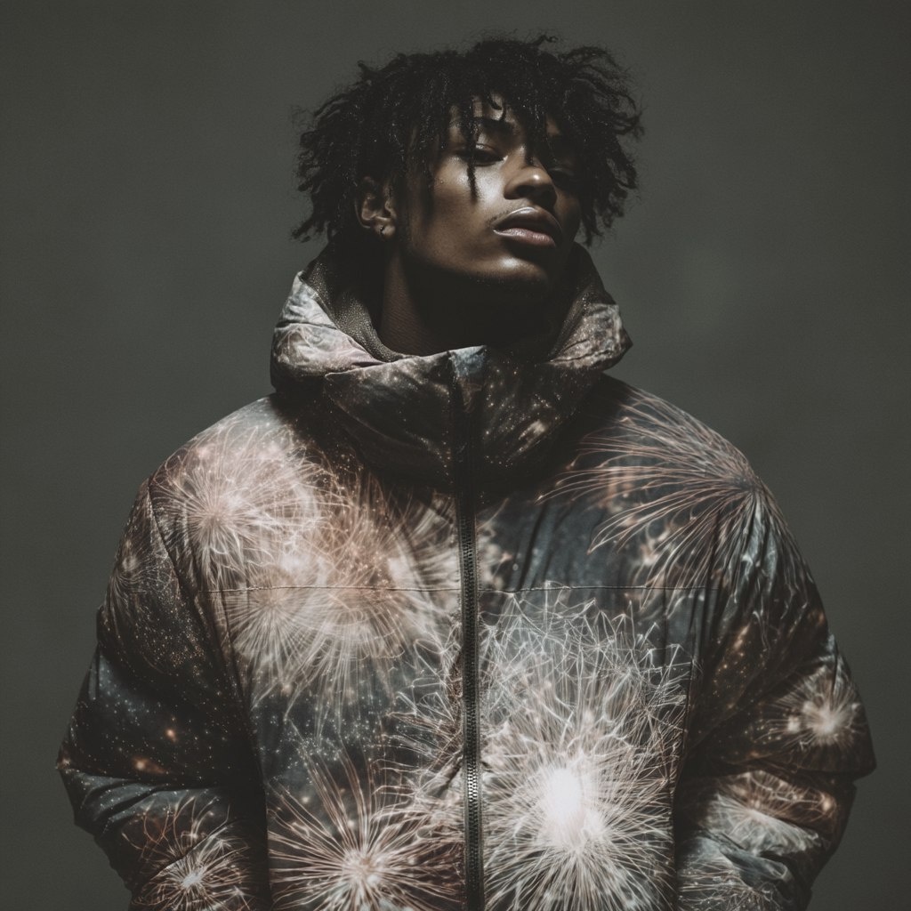 Создано на основе запроса: natural fashion photoshoot minimalist fiber optic floral owls puffer jacket design by Office horus worn by male