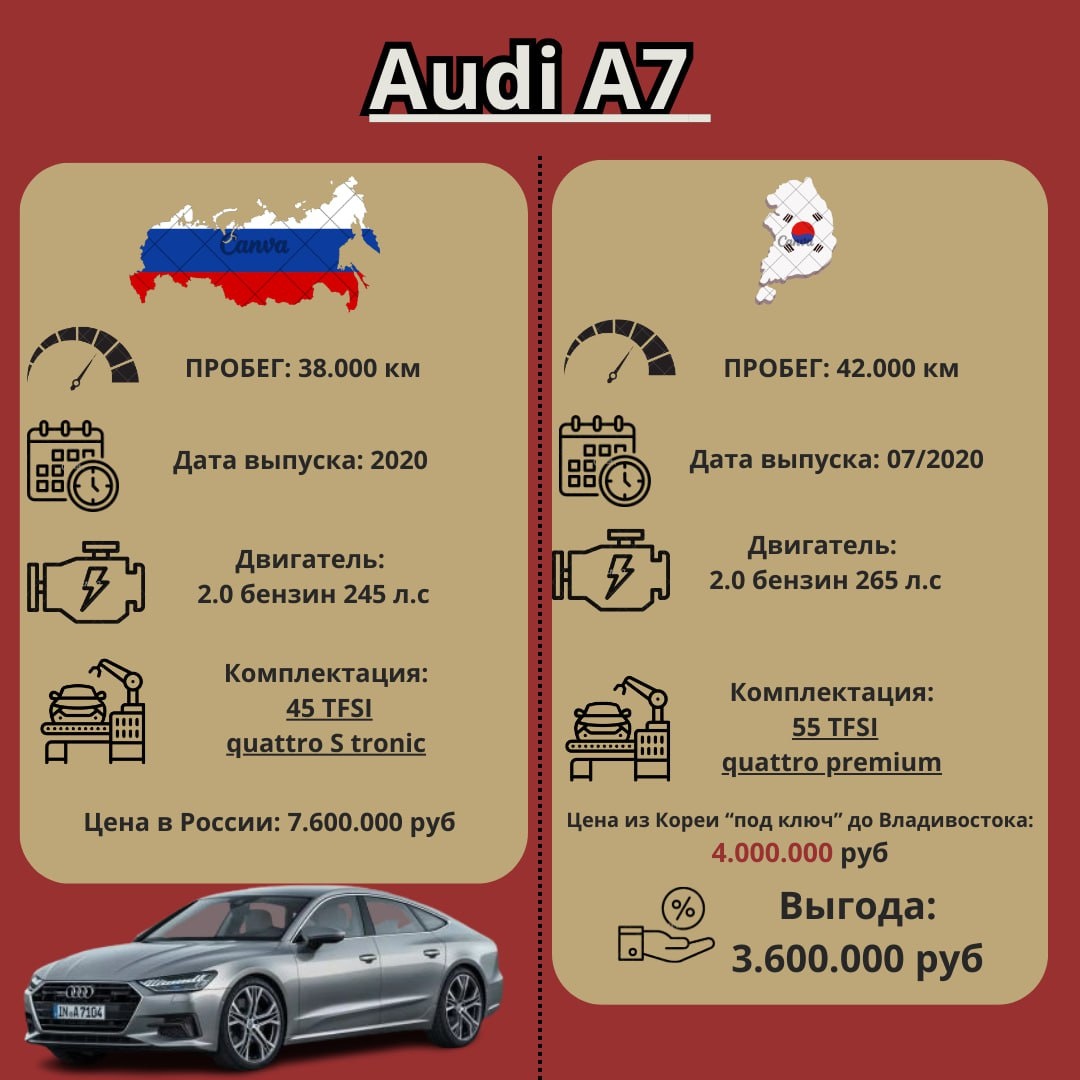Сегодня в рубрике #Что_по_ценам? Авто – Audi A7 Сравниваем стоимость автомобиля в России и при заказе через нас из Южной Кореи. Объявление в РФ Стоимость в России: 7 600 000 рублей Пробег: 38 000 км Комплектация: 45 TFSI quattro S tronic Теперь смотрим автомобиль в Южной Корее Что включено в цену при заказе через нас? ✅ Сам автомобиль ✅ Осмотр и переоформление в Корее ✅ Логистика до порта Владивосток ✅ Утилизационные сборы и таможенное оформление 💰 Цена «под ключ» до Владивостока: 4 000 000 рублей 🚗 Пробег: 42 000 км 💡 Цена конечная, без скрытых платежей, актуальна на сегодняшний день! 🔥 Выгода – 3 600 000 рублей! ❗️ Конкретно этот автомобиль доступен для выкупа на момент публикации. Если он будет продан, мы подберем аналогичный вариант под ваши требования по году, комплектации и пробегу. Если необходимо доставить авто в ваш город — мы тоже все организуем! Почему стоит заказать авто через нас? 💡 Бесплатный расчет стоимости. Узнав цену, вы приятно удивитесь! Свяжитесь с