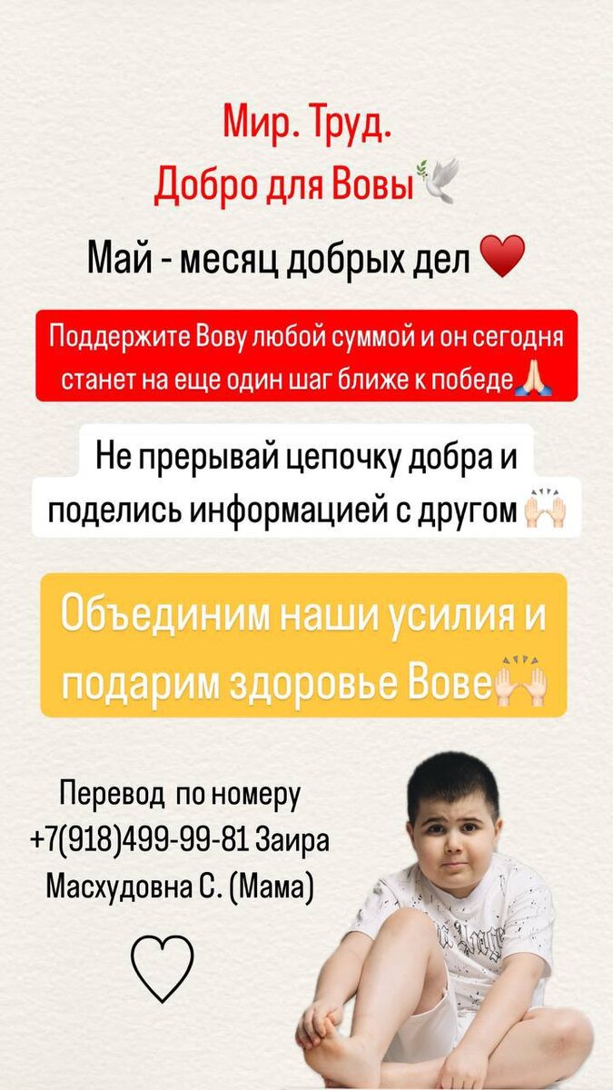 Дорогие наши праздники так же как и выходные очень сложные для сбора, а нам нельзя останавливаться. Очень прошу не забывать про Вову рассказать всем кому только можно 🙏 выложить в статусы мессенджеров 🙏 давайте двигаться к очень значимому числу, двух значимому числу в сборе 🚀 любая посильная сумма приблизит нас с Вам к этой цели 🎯 https://vova-solovyev.ru/