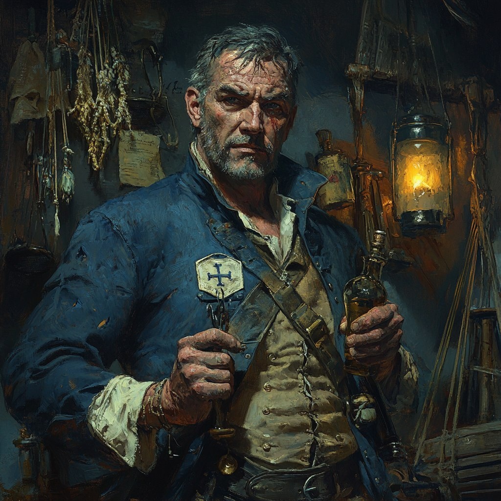 Создано на основе запроса: A dramatic 18th-century character portrait of a French naval surgeon-turned-pirate, standing in a ship's medical cabin. Gaunt man with tired eyes, wearing a weathered blue coat with faded medical insignia. He holds a leather-bound medical kit in one hand and a bottle of rum in the other, surrounded by hanging herb bundles, brass surgical tools, and nautical charts. Soft candlelight illuminates his face, casting shadows of ship rigging behind him. Painting style reminiscent of classic maritime art with realistic textures and muted gold/blue tones. --- Автоперевод: Драматический портрет персонажа 18-го века французского военно-морского хирурга, ставшего пиратом, стоящего в медицинской кабине корабля. Неплохо выглядит? 🤔 https://dzen.ru/id/65c0c65c86e4f837c27b24d7 #ИИ #AI #нейросеть #midjourney #art
