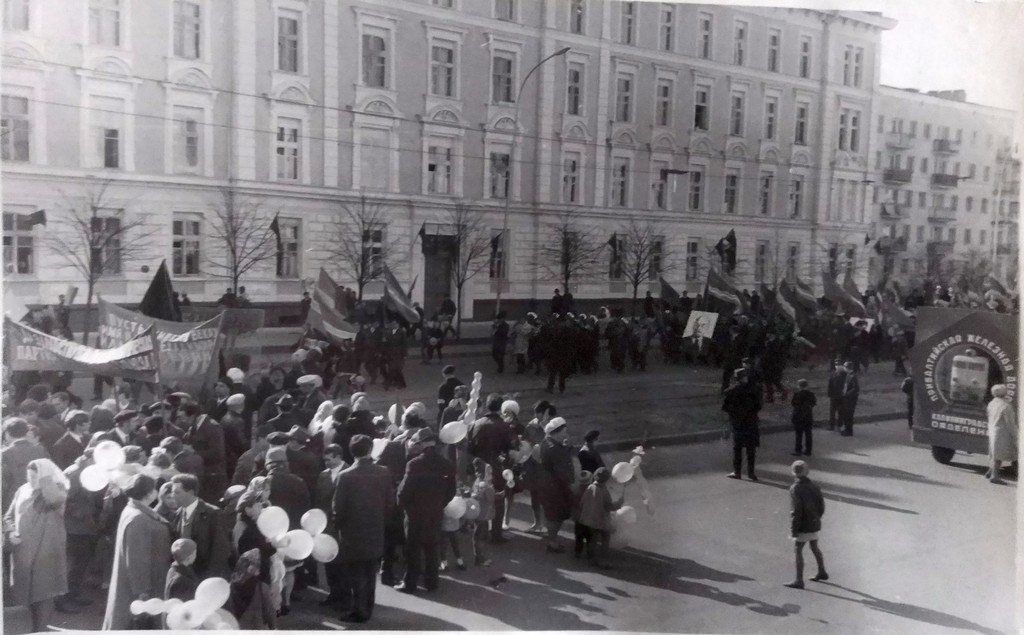 Что из прошлого: снимок Первомая в Калининграде Жители города идут по Ленинскому проспекту. Рабочие представляют свои предприятия, целыми семьями шефствуют горожане. А вы ходили на праздничную демонстрацию?