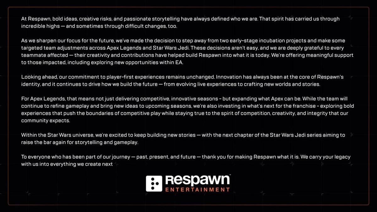 @dailyhardcore1 Respawn Entertainment приняла непростое решение: студия отменила разработку двух проектов на ранней стадии. Это может быть связано с желанием развеять слухи о Titanfall 3 и не давать фанатам ложных надежд. Сейчас разработчики полностью сосредоточились на: Улучшении Apex Legends Создании третьей части Star Wars Jedi Поддержке новой стратегии Star Wars: Zero Company (от создателей XCOM)