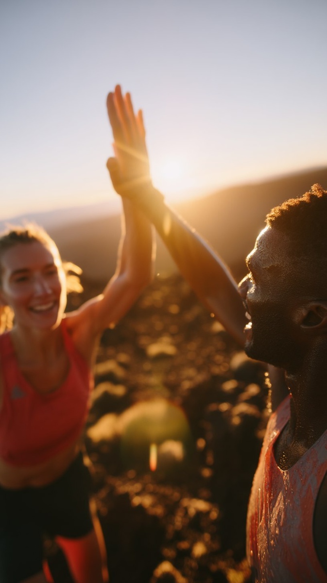 Создано на основе запроса: Two athletes high-fiving after intense trail run on volcanic terrain, GoPro wide angle close-up, sweat glistening