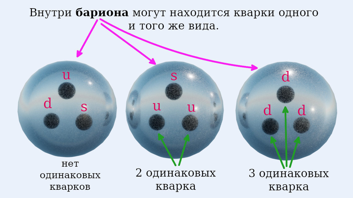 Важной особенностью является то, что барион может содержать внутри себя два или три кварка одного и того же вида. Комбинируясь между собой в различных вариациях, три кварка способны создать множество отличающихся барионов. Проще говоря, с помощью комбинаторики с повторениями мы можем высчитать не только общее количество возможных комбинаций барионов, но и их отличительные черты.