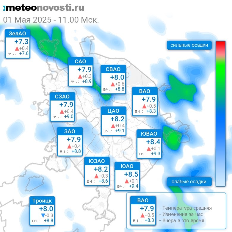 В 11:00 в Москве было от +7.1°C до +8.8°C, средняя температура +8.1°C #погода #Москва #весна #температура #1мая #четверг