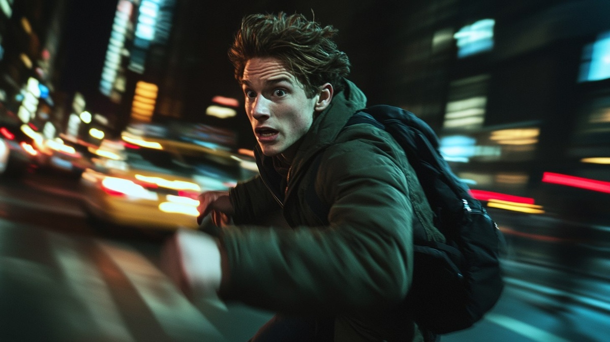 Создано на основе запроса: A dramatic night scene on the streets of Manhattan. A 20-year-old american male is running, looking over his shoulder with a startled expression, as if someone is chasing him. --- Автоперевод: Драматическая ночная сцена на улицах Манхэттена. Интересно получилось? 🤔 https://dzen.ru/id/65c0c65c86e4f837c27b24d7 #ИИ #AI #нейросеть #midjourney #art