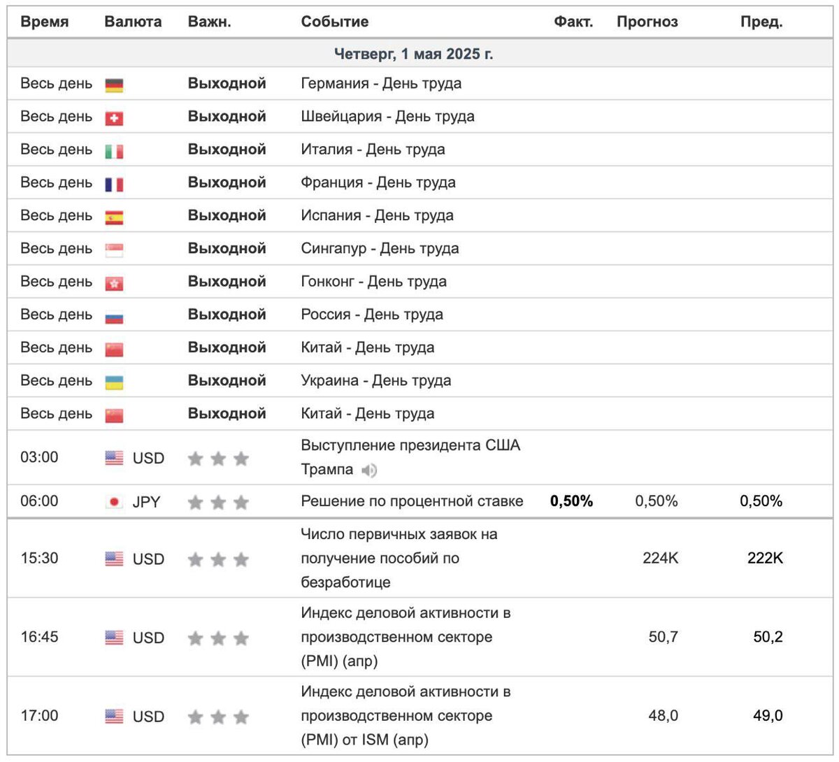 На 1 мая 2025 года в США опубликованы ключевые экономические показатели: индекс деловой активности в производственном секторе (PMI) и данные