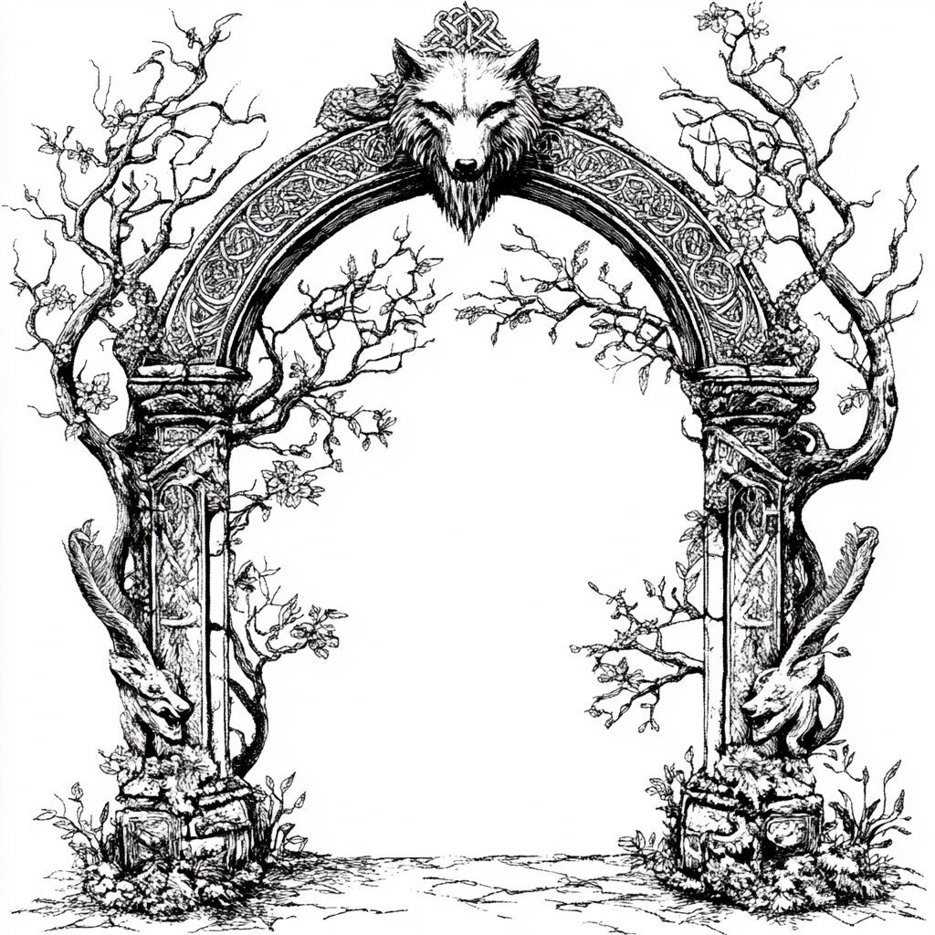 Создано на основе запроса: a viking stone archway in an outline for in black and white with norse images and symbolism, a vector image with a small amount of details that can easily be scaled, with nothing in the middle of the arch, a large wolf head in the center, a bit of detail with tree branches and flowers either beside the arch or in a geometric, hand-painted style --- Автоперевод: Каменная арка викингов в контура для черно-белого с норвежскими изображениями и символикой, векторным изображением с небольшим количеством деталей, которые можно легко масштабировать, ничто в середине арки, большая волчья голова в центре, немного детали с ветвями деревье Как тебе это изображение? 🤔 https://dzen.ru/id/65c0c65c86e4f837c27b24d7 #ИИ #AI #нейросеть #midjourney #art
