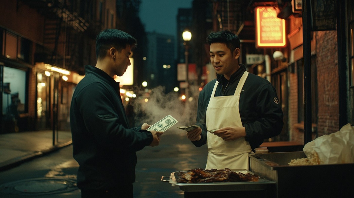 Создано на основе запроса: A cinematic night scene on a Manhattan street. A 20-year-old Asian male is handing a $20 bill to a spare ribs restaurant employee under the glow of a streetlight. The young man wears casual streetwear and has a sincere, slightly embarrassed smile. The BBQ worker, still in a grease-stained apron, looks surprised and appreciative as he accepts the tip. Neon signs, brick buildings, and steam rising from a manhole fill the background, creating a moody yet heartwarming urban atmosphere. The scene feels like a still from an indie film, capturing a quiet moment of gratitude. --- Автоперевод: Кинематографическая ночная сцена на Манхэттен -стрит. Как тебе такая картинка? 🤔 https://dzen.ru/id/65c0c65c86e4f837c27b24d7 #ИИ #AI #нейросеть #midjourney #art