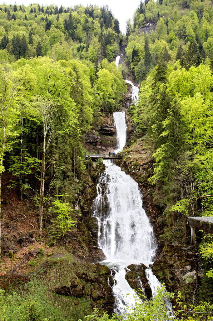 В Бриенц мы поехали посмотреть водопады Гисбах (Giessbach Falls). Водопады считаются самыми романтичными и красивыми водопадами в Швейцарии! Небольшая горная река Гисбах, длиной 11 км., впадает в Бриенцское озеро на высоте 564 метра выше уровня моря напротив города Бриенц, и перед впадением в озеро, она образует знаменитый каскад из 14 водопадов, расположенных один над другим, при общей высоте падения 400 м. В одном месте тропа, проложенная тут с 19 века, проходит под водопадом. Есть мостик, с которого открывается потрясающий вид на каскады и отель. Рядом с водопадом есть еще одна достопримечательность – исторический Grandhotel Giessbach, который был построен в 1875-1883 годах. В 1883 году здание пострадало от пожара, и было восстановлено в тот же год. Именно тогда отель приобрёл элементы швейцарского деревянного деревенского зодчества. Большая часть здания выстроена из дерева с применением металлоко