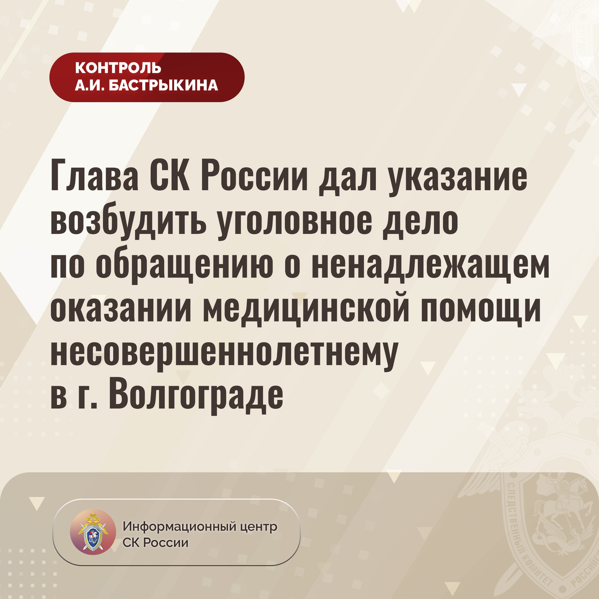 Глава СК России дал указание возбудить уголовное дело по обращению о ненадлежащем оказании медицинской помощи несовершеннолетнему в г. Волгограде В приемную Председателя СК России А.И. Бастрыкина «ВКонтакте» обратилась жительница города Волгограда по вопросу несогласия с ходом установления обстоятельств смерти ее 16-летнего сына. В апреле текущего года после соревнований по футболу у подростка по месту жительства произошел сердечный приступ. Прибывшей бригаде скорой медицинской помощи удалось реанимировать мальчика. Однако спецтранспорт был направлен для госпитализации в медицинское учреждение, расположенное в значительном отдалении, несмотря на то, что сотрудники близлежащего кардиологического центра были готовы принять ребенка. В результате сын заявительницы скончался при транспортировке. До настоящего времени меры к привлечению виновных к ответственности не принимаются. Ситуация освещалась в СМИ. В СУ СК России по Волгоградской области по данному факту проводится процессуальная пров