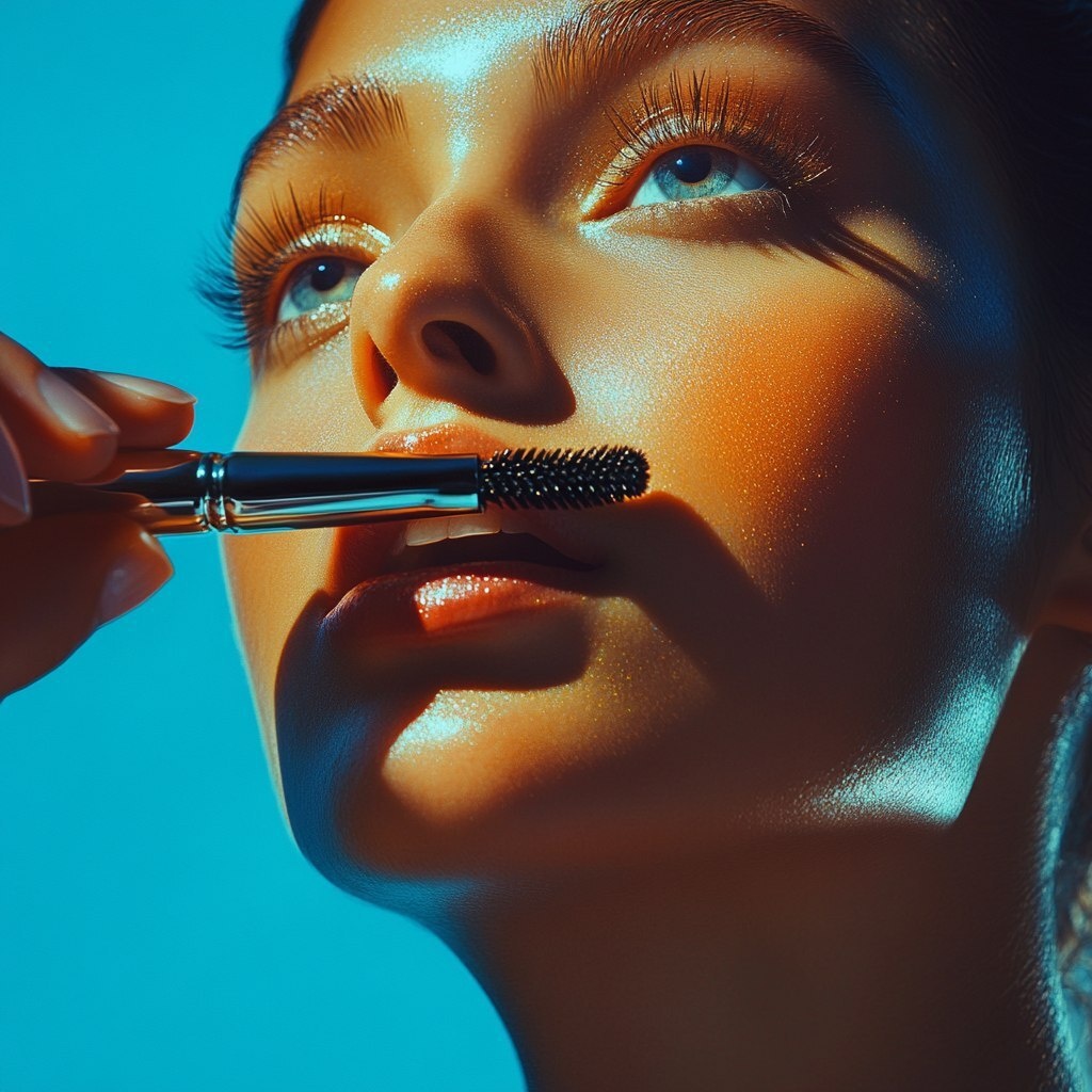 Создано на основе запроса: a lady model having a mascara in her hands in sunlight with light realistic blue background , the whole image is