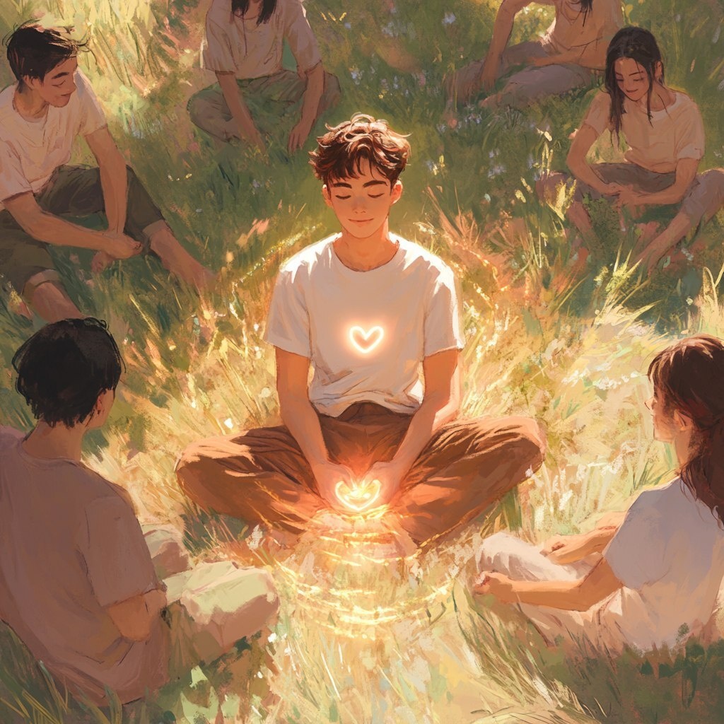 Создано на основе запроса: View from an elevated diagonal angle. In the center of a peaceful grassy field, a cute, highly abstract teenage man sits cross-legged calmly. He wears a loose white t-shirt and brown pants, with minimal or no facial features. A soft glowing ring of light radiates outward from his heart, forming a subtle halo around him and his nearby friends. Surrounding him are several similarly-aged, abstract-style friends sitting or lying on the grass in a loose circle, smiling gently toward him and sharing the quiet moment. The scene is rendered in soft pastel colors like peach, blush pink, and golden yellow, with a warm, dreamy atmosphere that evokes friendship, inner peace, and quiet connection. Abstract, pastel-style illustration --- Автоперевод: Вид с повышенного диагонального угла. Неплохо получилось? 🤔 https://dzen.ru/id/65c0c65c86e4f837c27b24d7 #ИИ #AI #нейросеть #midjourney #art