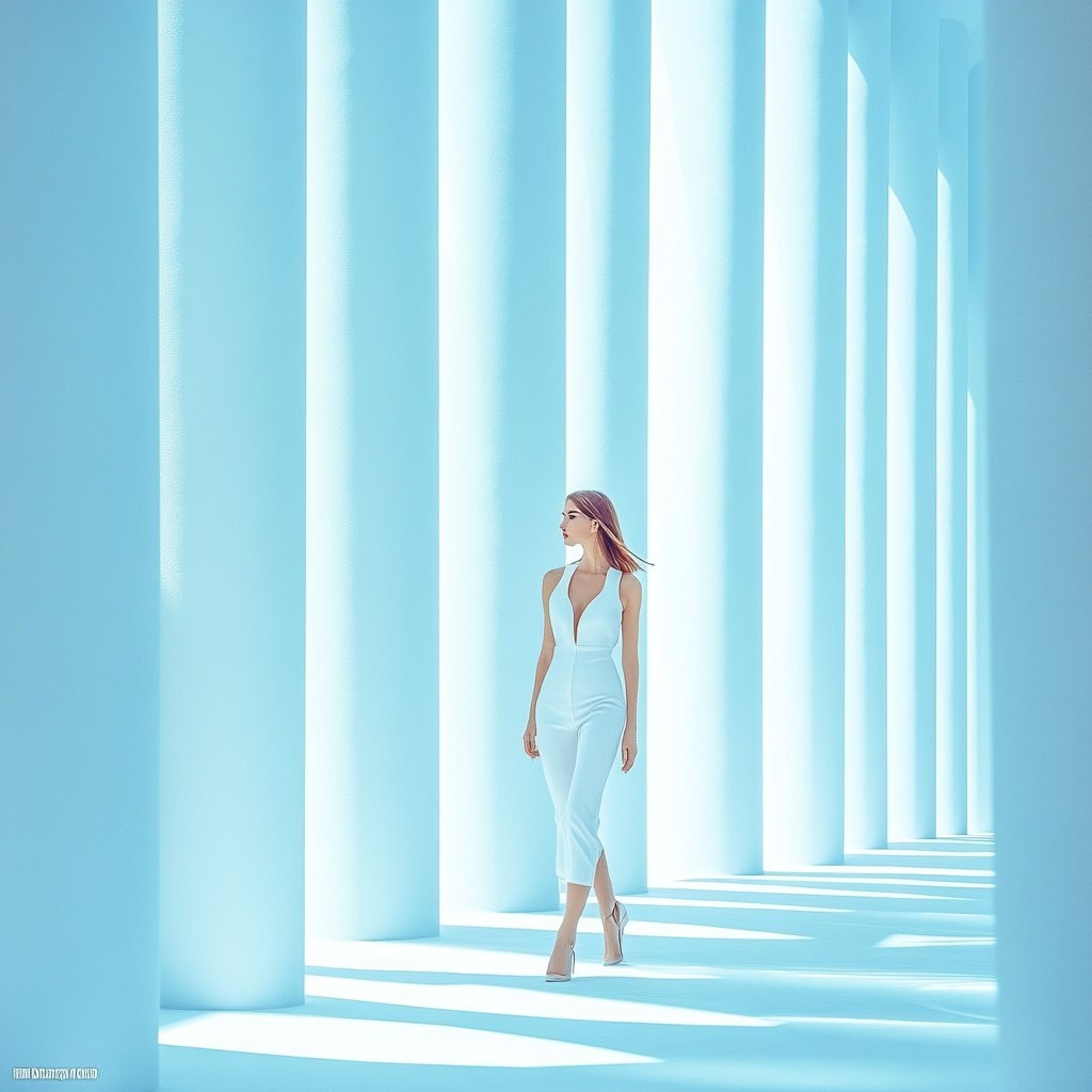 Создано на основе запроса: a lady model with modern outfit walking through 5 huge columns with light blue background ang glossy vibe
