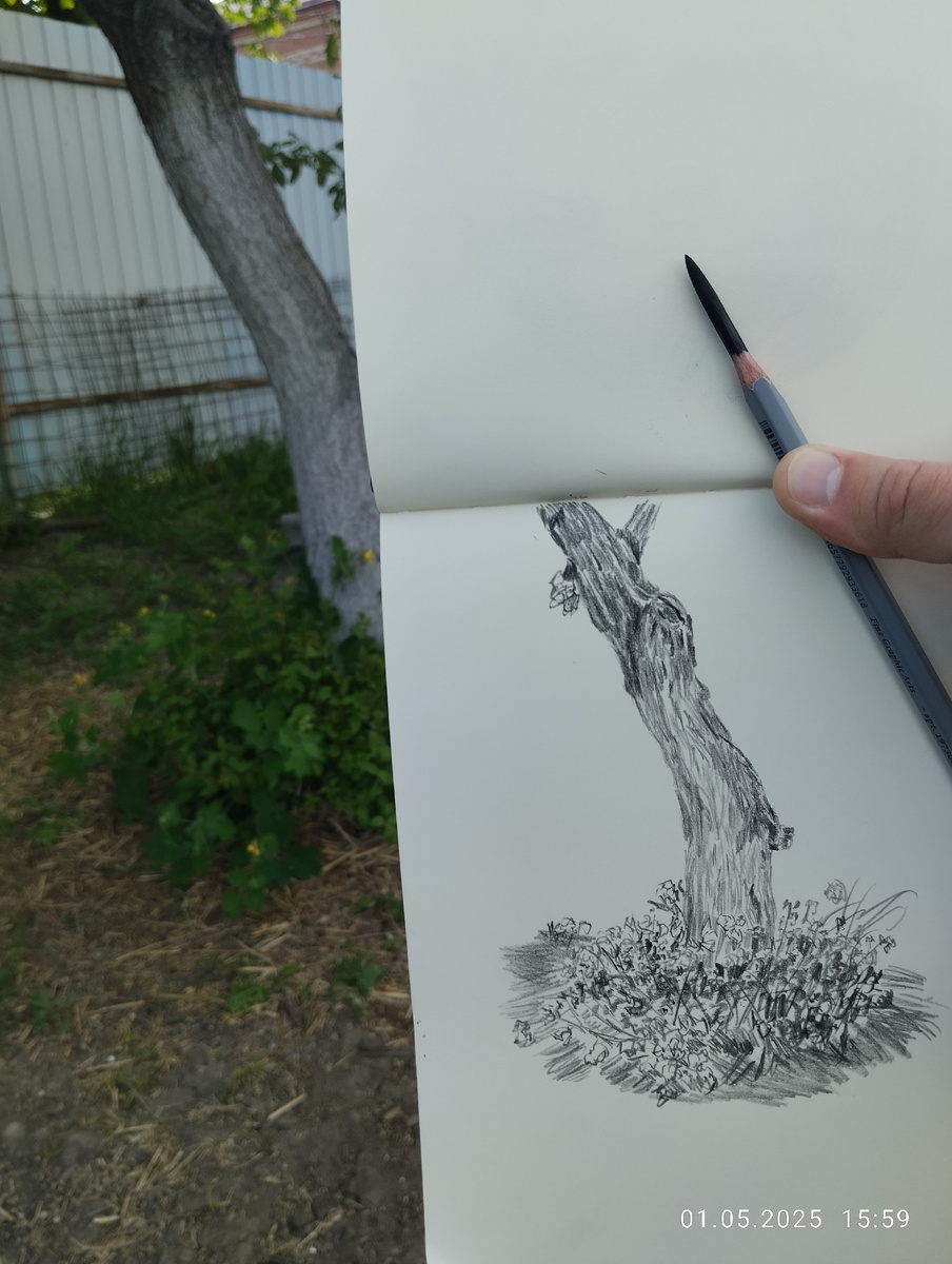 Здравствуйте друзья. Поздравляю вас с праздником 1 Мая, желаю вам здоровья, успехов и как можно больше положительных эмоций! А я продолжаю упражняться в рисовании с натуры. В этот раз сделал такой вот набросок сливы растущей во дворе. Для рисунка я использовал матовые гранитные карандаши маркировкой HB, 2B, 4B, 6B. Благодарю за внимание.)