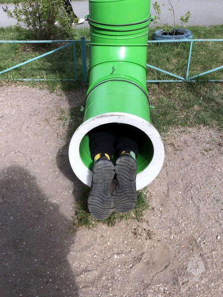«На улице Хохрякова 12-летний мальчик играл на детской площадке и... застрял в трубе. На место выехали четыре сотрудника МЧС России. Специалисты разобрали конструкцию и вызволили мальчишку из западни», — прокомментировали снимки в региональном управлении МЧС.