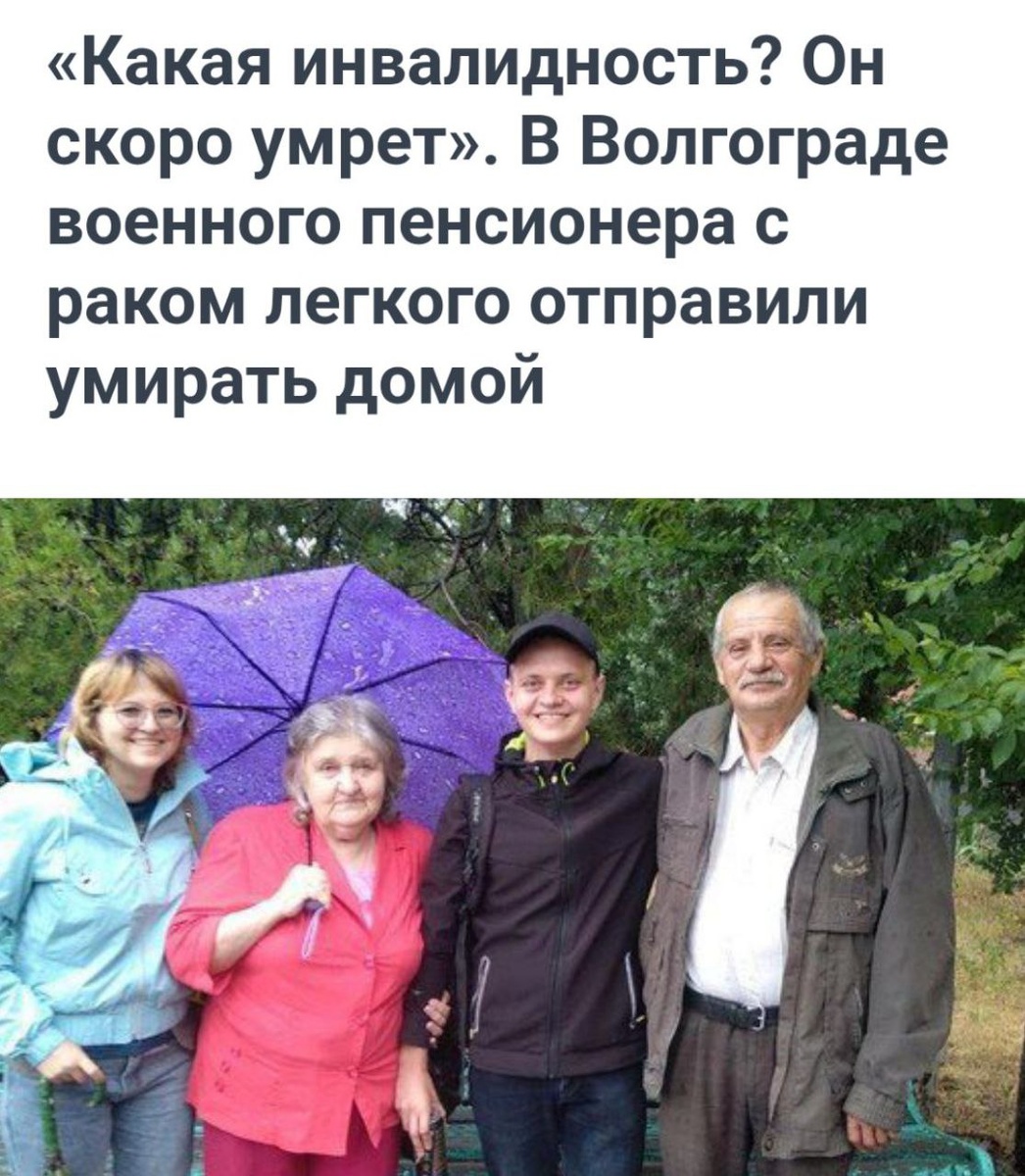Ветерану с раком отказали в лечении В Волгограде 60-летнему военному пенсионеру Игорю Мащуку отказали в лечении онкологического заболевания. Несмотря на выявленную флюорографией опухоль, врачи не назначили терапию. Месяц ожидания привел к росту метастаз, после чего мужчине попросту отказали в помощи. Ветеран умер, так и не получив необходимого лечения.