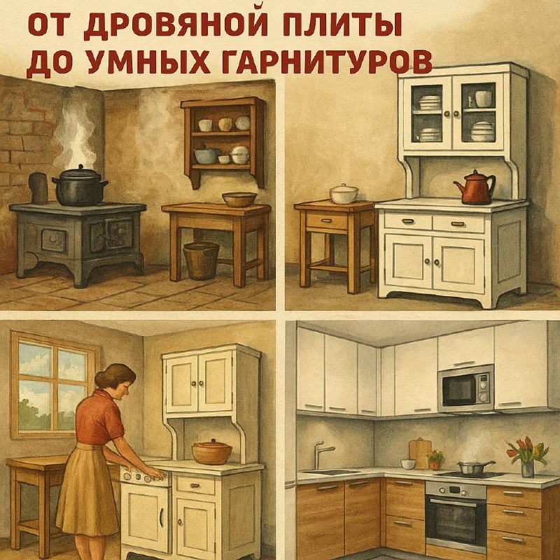 Как менялась кухня: от дровяной плиты до умных гарнитуров В честь 1 мая — праздника труда — вспоминаем, как труд на кухне становился легче. 🫖Кухня всегда была сердцем дома, а мебель — её основой. В XIX веке кухонный труд был настоящим испытанием: тяжёлые чугунные плиты, вода из колодца, посуда на открытых полках. Гарнитуры? О них никто и не мечтал. Всё собиралось по принципу "что есть, то и работает". В начале XX века появляются первые "кухонные буфеты" — предки современных шкафов. Простые, но функциональные, они символизировали первые шаги к упорядоченности. Настоящая революция произошла после Второй мировой: в 1950-е годы женщины массово выходят на работу, а дизайнеры мебели начинают думать не только о форме, но и об эргономике. Так рождается модульная кухня — помощник в экономии времени и сил. Сегодня кухня — это и рабочее пространство, и место отдыха, и воплощение технологий. Но за всем этим стоит труд поколений — тех, кто создавал удобство своими руками. А как выглядела