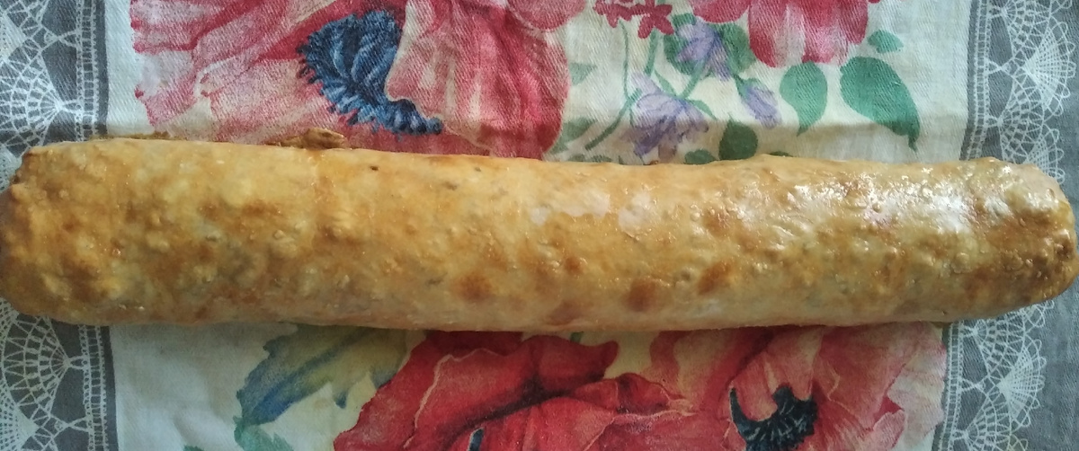 Состав: -мука-200г. -яйцо-1 -сметана-30г. -растительное масло-20г. -соль-5г. начинка: -яблоко-400г. -изюм-100г. -орех грецкий-50г. -сухарь молотый-10г. -корица-10г. Яблоки чистим, режем мелким кубиком, изюм заливаем горячей водой и оставляем на 5 мин., орех трём на тёрке. Смешиваем яйцо, сметану, масло. соль. добавляем муку и замешиваем тесто. Оставляем тесто в целлофановом пакете на 15 мин., затем достаём тесто и раскатываем его на полотенце в тонкий пласт. Посыпаем тесто сухарями, раскладываем яблоки, посыпаем корицей, орехом, изюмом. С помощью полотенца закручиваем рулет. Укладываем штрудель на противень и смазываем яйцом. Выпекаем штрудель в разогретой до 180 градусов духовке 30 мин. Приятного аппетита.