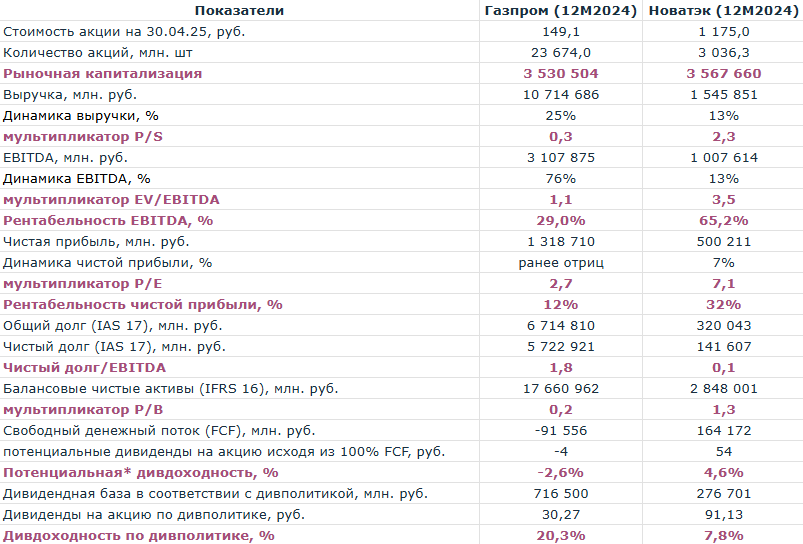 30 апреля Газпром опубликовал шикарный отчет за 2024 год. Однако, котировки GAZP не колыхнулись. Чего ждут инвесторы? А главная интрига заключается в том, будут ли выплачены дивиденды за 2024 год? В соответствии с дивполитикой Газпрома (50% от чистой прибыли, приходящейся на акционеров, скорректированной на неденежные доходы, при условии Чистый долг/EBITDA < 2.5) дивиденды за 2024 год должны составить 30,27 рублей на акцию. А это 20% дивдоходности. Однако, свободный денежный поток за 2024 год у GAZP был отрицательным (см. таблицу). Соответственно, дивиденды за 2024 год платить не из чего. Более того, бюджет РФ не заложил на 2025 год дивидендные поступления от Газпрома. Однако, есть нюанс. В октябре 2024 Газпрому отменили повышенный НДПИ. То есть, с 2025 года свободный денежный поток увеличится на 600 млрд. руб. Кроме того, менеджмент Газпрома в декабре 2024 прогнозировал снижение капитальных затрат в 2025 году до 1 524 млрд. руб., что потенциально может высвободить ещё 898 млрд. руб.