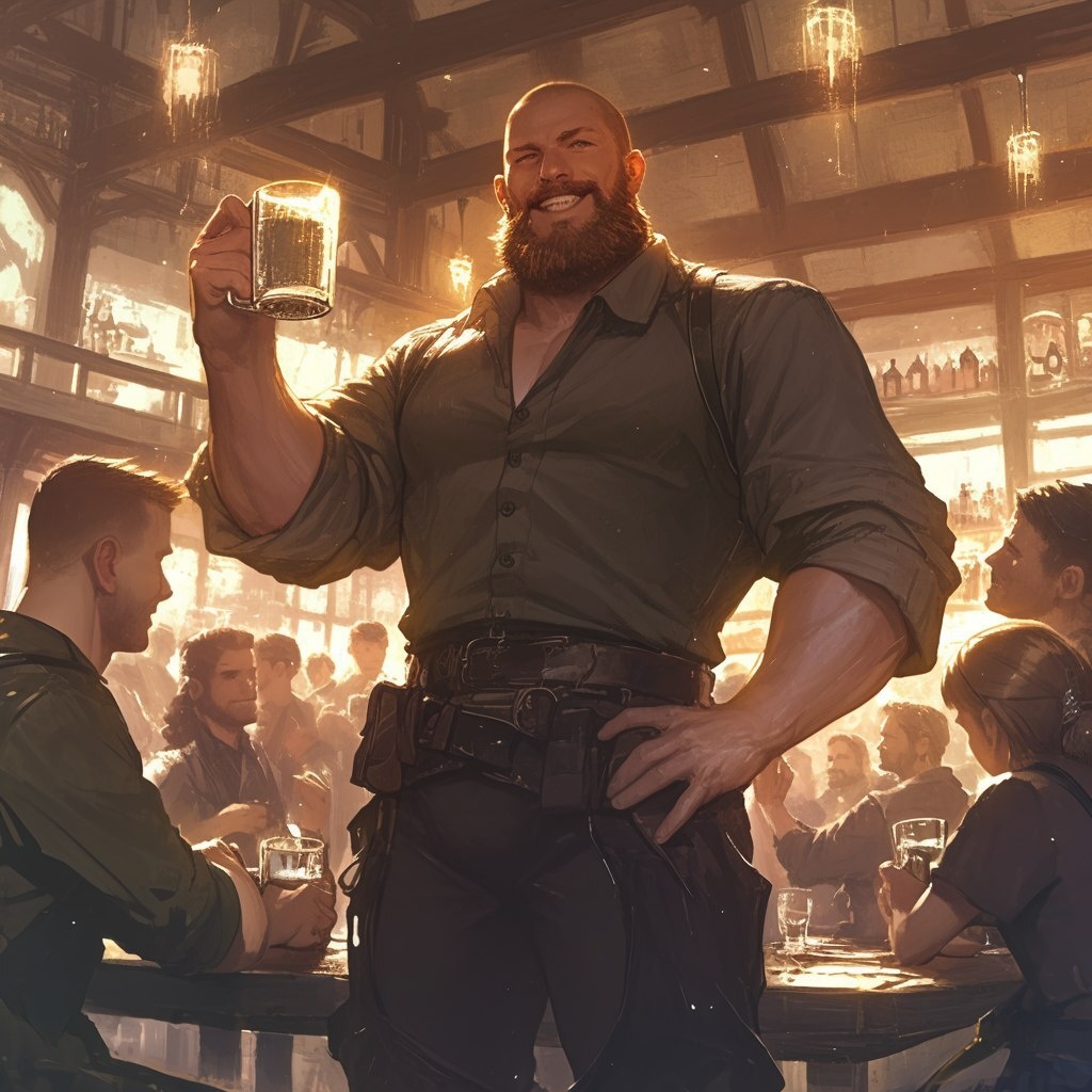 Создано на основе запроса: Man, middle age, brown well-kept short beard, bald, very shiny head, muscular, blue eyes, brown armless tunic, tan pants, brown boots, Cleaning drinking glass behind bar counter, smiling, tavern, warm fire light, lots of people eating and talking, wideshot --- Автоперевод: Человек, средний возраст, коричневая хорошо сбоящаяся борода, лысая, очень блестящая голова, мускулистые, голубые глаза, коричневая туника без вооружения, коричневые брюки, коричневые ботинки, чистка пить Необычно вышло? 🤔 https://dzen.ru/id/65c0c65c86e4f837c27b24d7 #ИИ #AI #нейросеть #midjourney #art