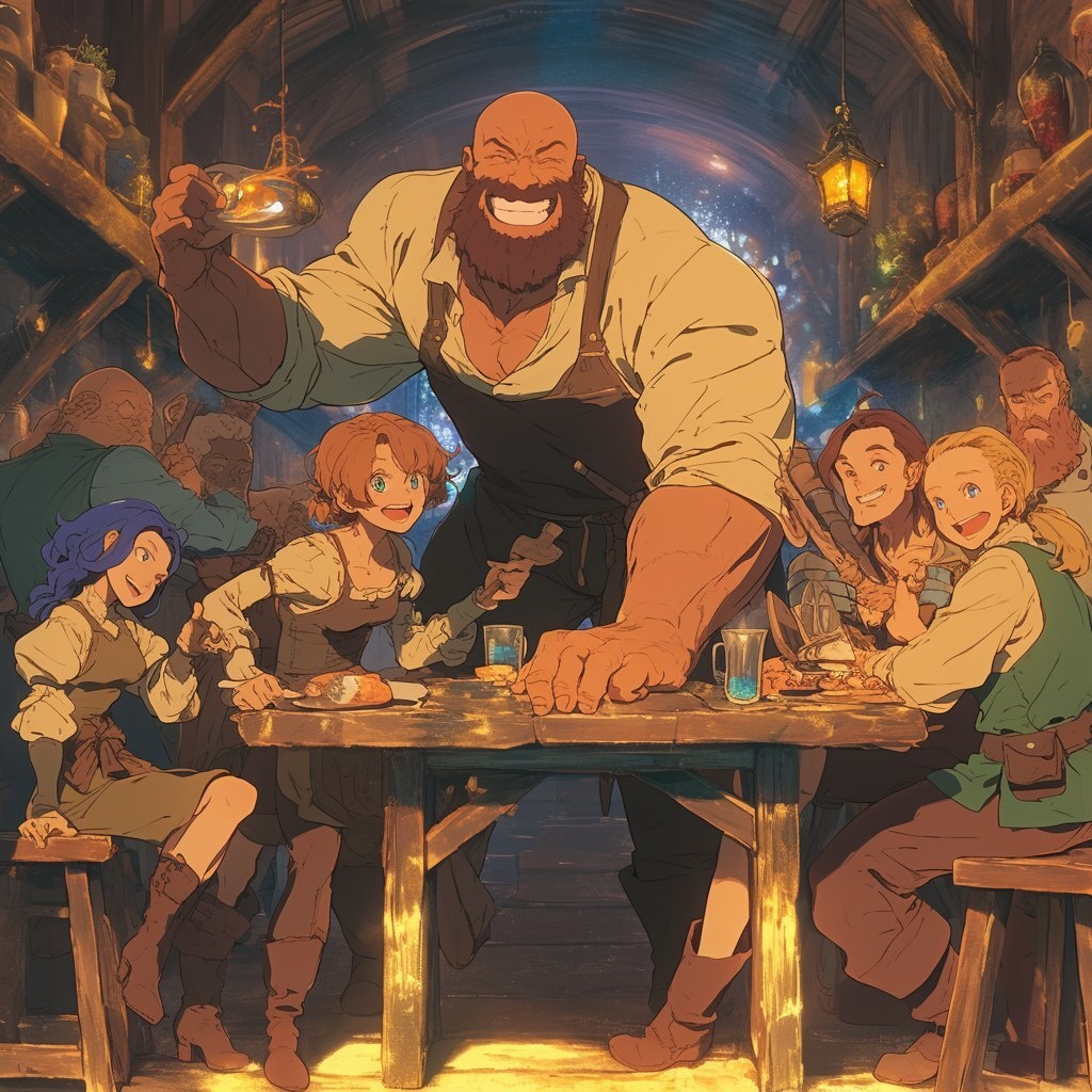 Создано на основе запроса: Man, middle age, brown well-kept short beard, completely bald, very shiny shining head, muscular, blue eyes, brown armless tunic, tan pants, brown boots, Cleaning glass behind bar counter, smiling, tavern, warm fire light, lots of people eating and talking, animé, wideshot, --- Автоперевод: Человек, средний возраст, коричневая хорошо сбоящая борода, полностью лысая, очень блестящая сияющая голова, мускулистые, голубые глаза, коричневая туника без вооружения, коричневые брюки, коричневые ботинки, чистящее стекло за стойкой стойки, улыбающаяся, таверна, теплый огонь, много людей, едят и разговаривают, аними, Видшот, Красиво выглядит? 🤔 https://dzen.ru/id/65c0c65c86e4f837c27b24d7 #ИИ #AI #нейросеть #midjourney #art