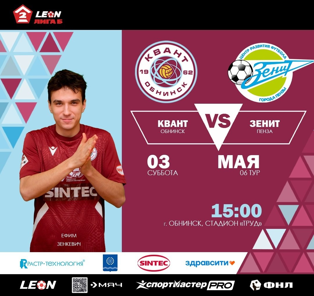 ⚽ Все на футбол 3 мая! Приглашаем болельщиков на стадион «Труд» 3 мая в 15:00. «Квант» принимает на домашнем поле «Зенит» из Пензы. Нашей команде нужна ваша поддержка. Встречаемся на стадионе! #обнинскспортивный #БолеюЗаКвант