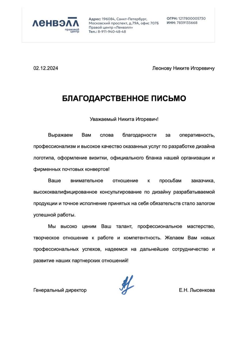 Официальное Благодарственное письмо от клиента.