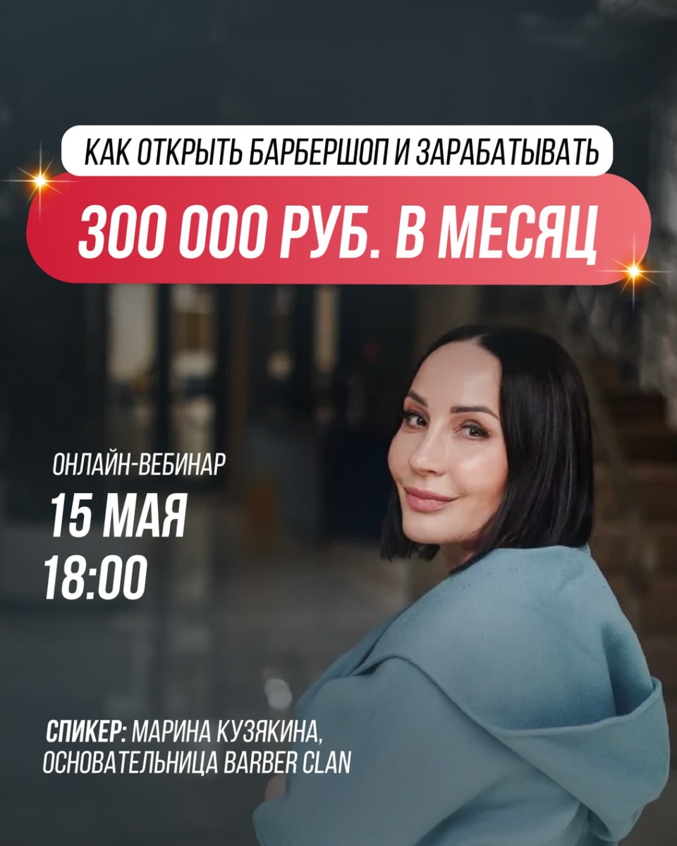 Привет, друзья! Уже 15 мая пройдет значимое для нас бизнес-событие и если вы хотите сделать X2 в доходе, пропускать его просто НЕЛЬЗЯ! Готовьтесь записать в календарь участие в онлайн-вебинаре с самой Мариной Кузякиной – основательницей федеральной франшизы Barber Clan на тему: Как открыть барбершоп и зарабатывать от 300 000 ₽ в месяц! 👏 Вы узнаете: – Как работает концепция экспресс-барбершопов Barber Clan – Какие шаги нужно сделать, чтобы начать свое дело – Как партнеры Barber Clan зарабатывают от 300 000 ₽ в месяц и более – Почему такая идея стала успешной по всей стране И главное – можешь задать абсолютно ЛЮБОЙ интересующий вопрос Марине лично! В прямом эфире она даст четкий и понятный ответ каждому участнику. ❗️ Почему пропускать НЕЛЬЗЯ НИКОМУ? Потому что повторений точно не будет, запись тоже не оставим – мы ценим ваше внимание и делаем такие мероприятия уникальными и живыми! 🖤 Когда? 15 мая в 18:00 Где? На платформе GetСourse. Регистрация по ссылке: https://docs.google.co