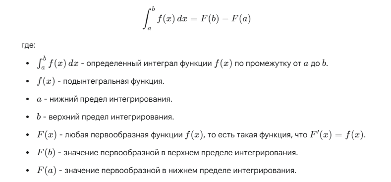 Суть формулы Ньютона-Лейбница: Эта формула устанавливает связь между определенным интегралом и первообразной функции. Она позволяет вычислять значение определенного интеграла, находя первообразную подынтегральной функции и вычисляя разность ее значений на верхнем и нижнем пределах интегрирования. Применение: Формула Ньютона-Лейбница является основным инструментом для вычисления определенных интегралов, которые широко используются в различных областях математики, физики, техники и других наук для нахождения площадей, объемов, длин дуг, работы силы, потока жидкости и многих других величин.