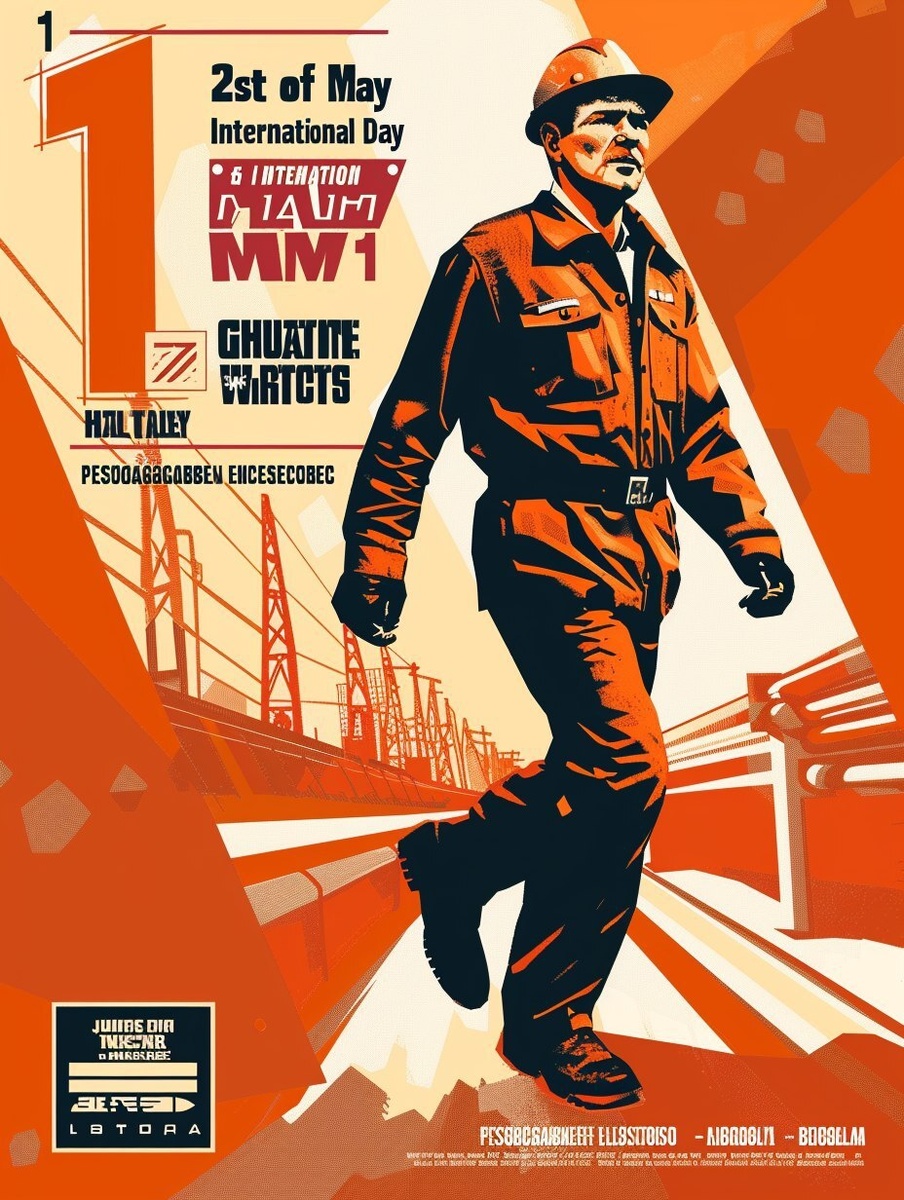 Создано на основе запроса: Modern retro-style poster for "1st of May - International Workers' Day", featuring a strong male worker in