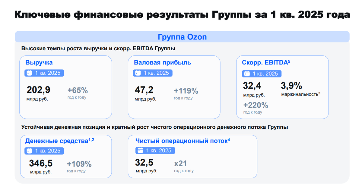 На 2025 год "Озон" ставит цель роста GMV на 30-40%, а также роста EBITDA до 70-90 млрд рублей. Впрочем, результаты первого квартала дают основания полагать, что по EBITDA цель может быть существенно перевыполнена. Показатель с высокой долей вероятности уйдет за 100 млрд. При совсем позитивных раскладах составит 110-120 млрд рублей.